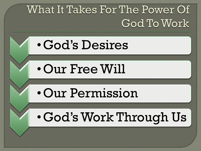 Our relatioship with God has to be a permission based relationship. This isn’t something we have a choice on; God requires it. The reason God spends so much time in the Bible and in His communication with you trying to convince you that what He says is true, is because He is honoring your free will. The reason you have to pray and ask God for certain things is because you have to get His permission before you can get it from Him. He has a free will; He has given you a free will; and He always honors your free will. God’s Work Through Us