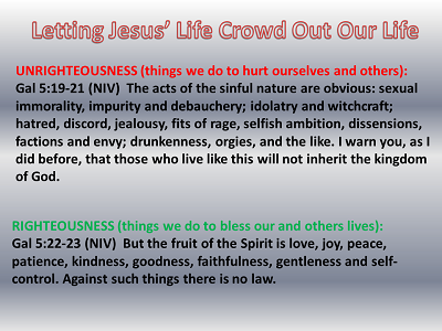 6. We want to do something that is very spectacular. Fulfilling all righteousness (doing those things that blesses us and others) helps us die out to our own selfish desires and yield to the will of God for us and all those around us. God doesn’t flow through unrighteousness. Everyone gets cheated with unrighteousness. Righteousness brings the blessings of God in us and through us to others. We need righteousness credited to our account. And, we need righteousness flowing through our lives. Salvation brought righteousness as being credited to our account so we could start receiving God’s help. Christ’s ministry in us causes righteousness to flow in and through our lives so we can be a help to ourselves and those around us. Mat 16:24 (NIV) Then Jesus said to His disciples, “If anyone would come after Me, he must deny himself and take up his cross and follow Me.” As we discussed in the beginnings of this study, this Scripture shows us what Christ’s ministry in us looks like. |
